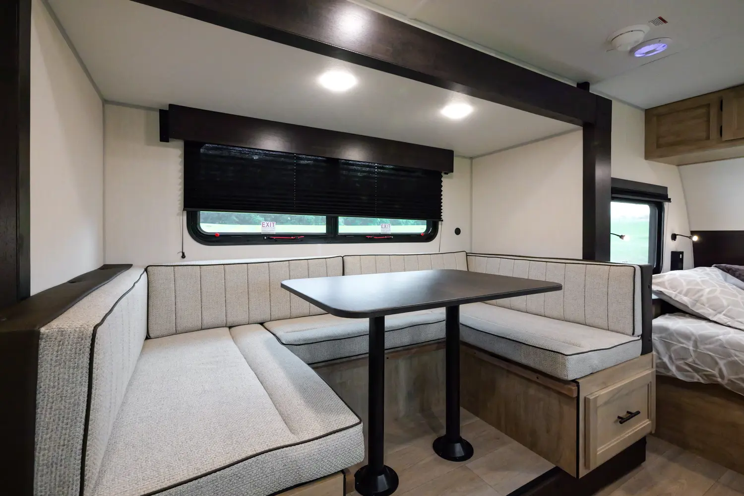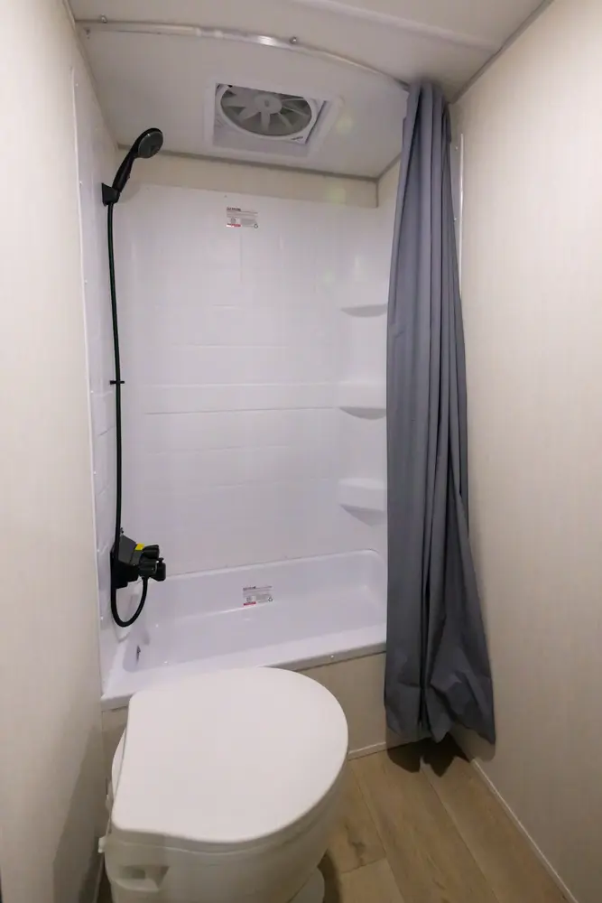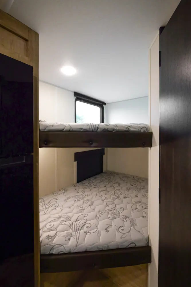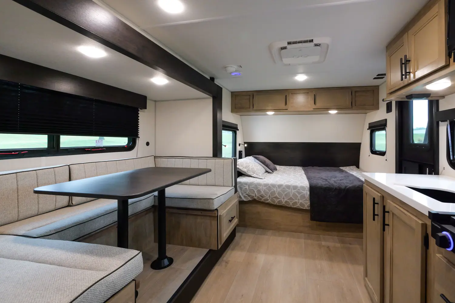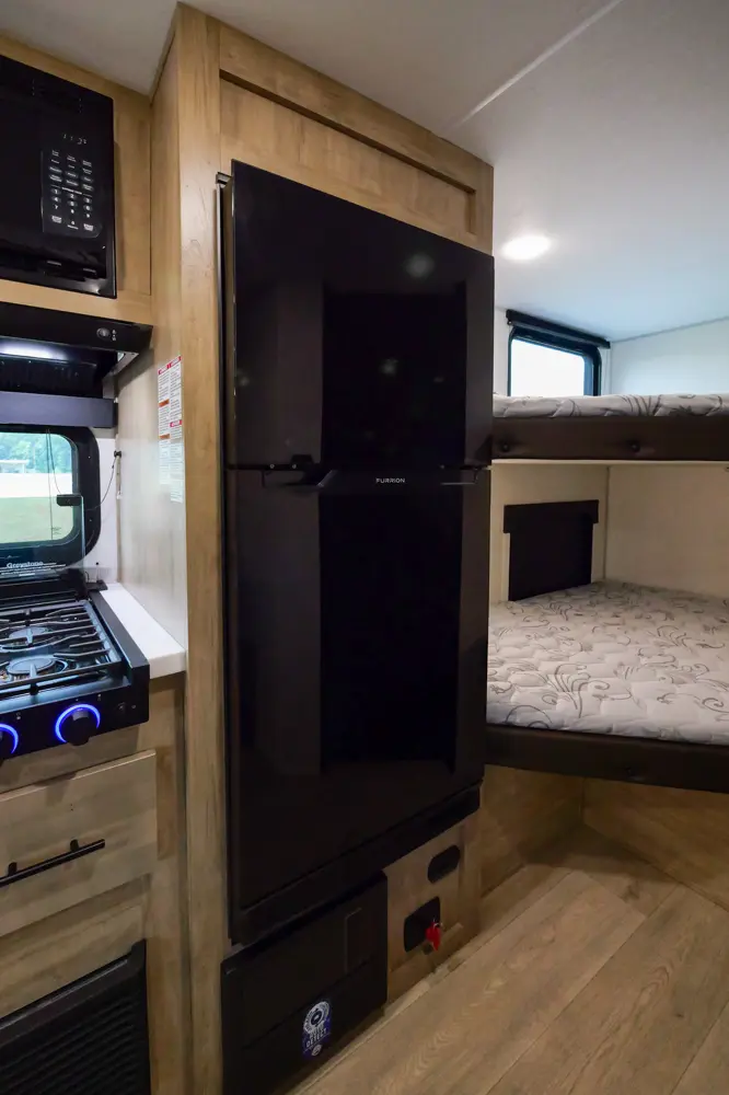 The 17JWBL is the embodiment of the family camper. The large U-shaped dinette offers great seating, full-size pull-out drawers, as well as additional sleeping for two adults. The master queen bed offers comfort, while housing huge under bed storage. A functional modern chef’s kitchen, and bathroom round out the interior of this class leading unit. The exterior under awning space provides ample entertaining space with the exclusive Pup kitchen, LED Power awning, exterior speakers, and TV bracket.