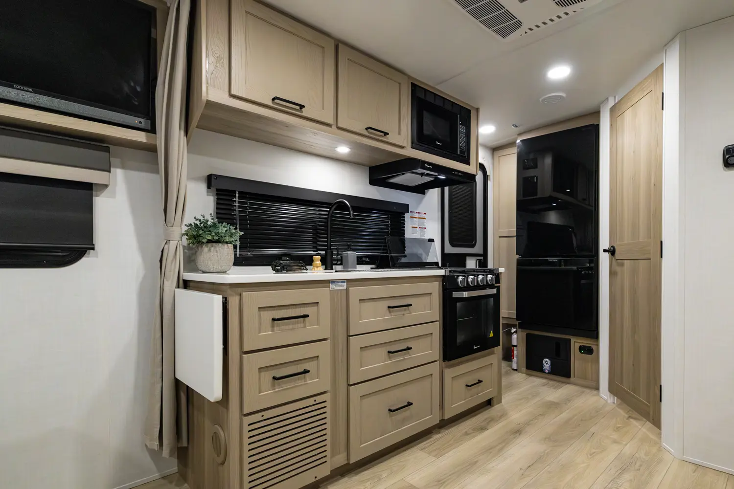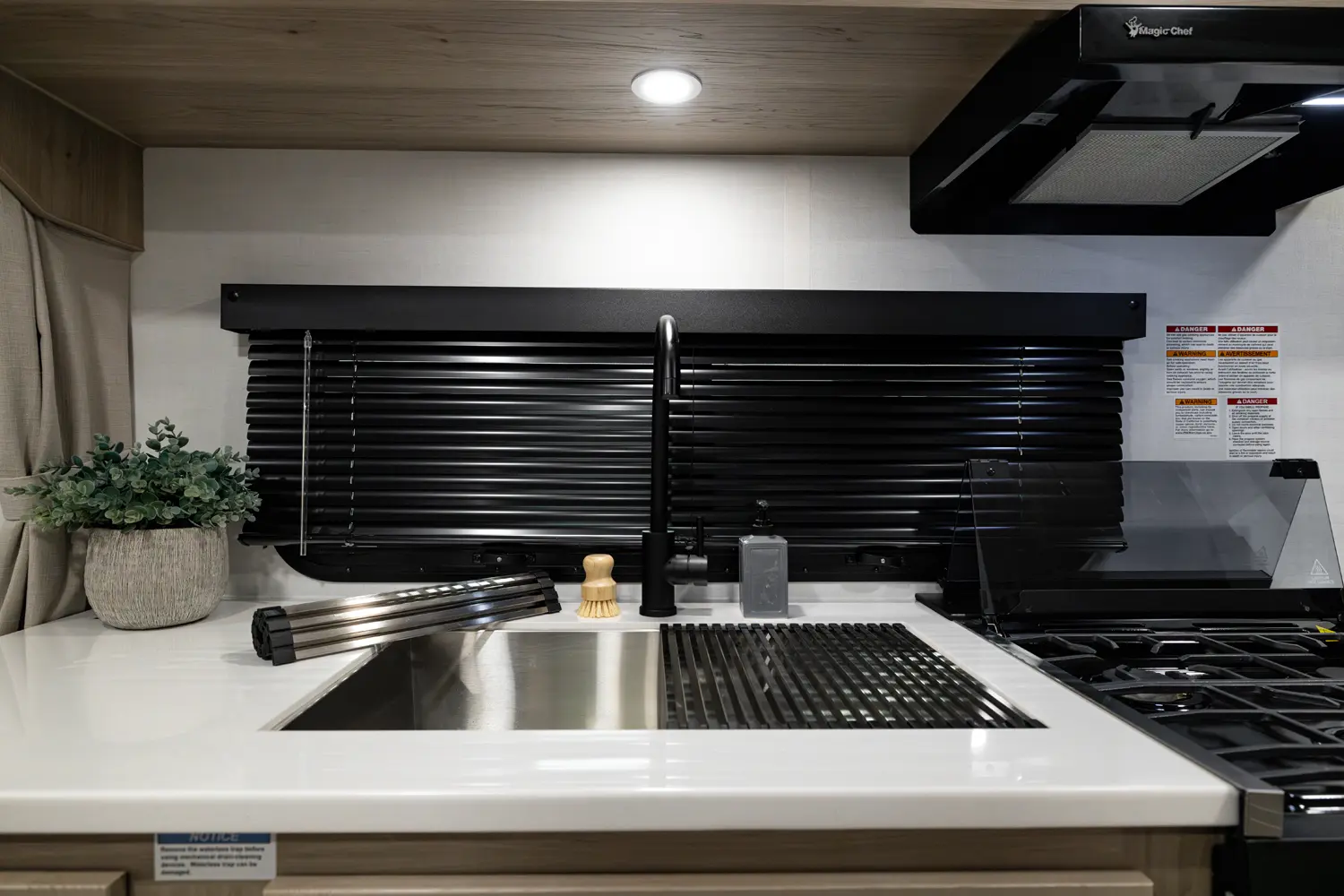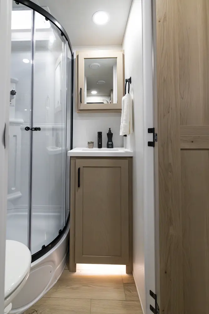 This unit has everything you need in a trailer under 23' feet. This big 60" X 74" queen bed with a wardrobe and night stand on both sides has privacy curtains to give the feeling of a separate bedroom. The fan above the bed and the three windows around the bed are added to enhance the camping experience. This trailer has a 72" sofa slide that allows for more space in the kitchen and entertaining center.
