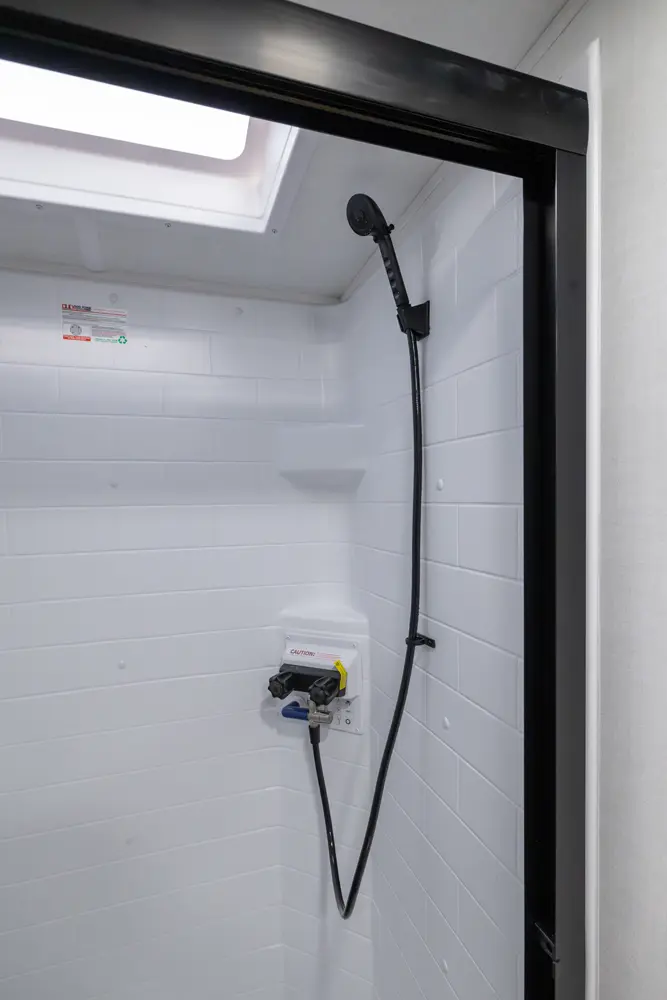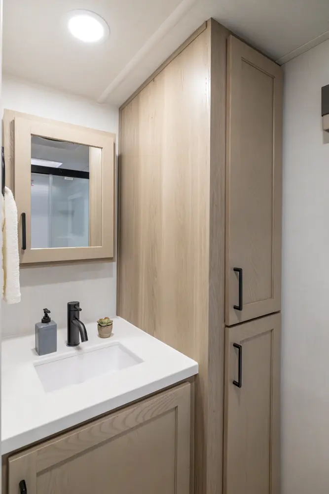 The front kitchen with a large window creates an open, inviting feel with great campsite views. Theater seating faces the entertainment center for easy viewing, with an optional hide-a-bed for guests. The bedroom includes a queen bed in a slide-out, dresser, and wardrobe with washer/dryer prep. A spacious bathroom with a large shower and linen storage adds comfort and convenience, making this coach feel like home.