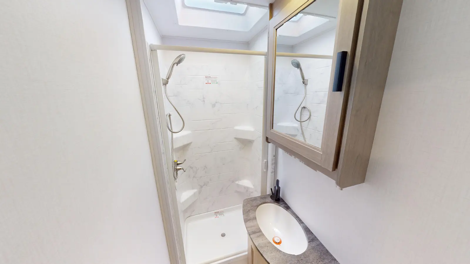 The Forester 2551DSLE kitchen features an undermount convection microwave and 10 cu. ft. refrigerator, plus a 12V TV with work station below. There's a pantry and wardrobe next to the bedroom. You'll enjoy a queen bed, a divider for privacy, and you can add your own TV thanks to the prewired location. The full bathroom includes linen storage just outside the door. And the furniture and bunk over cab provide sleeping space for your guests. This model is built on a Ford E450 chassis.