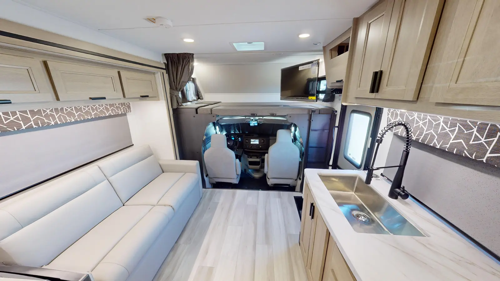The Forester 2851SLE sits on a Ford chassis, features a single slide out for added interior space, and contains sleeping room for seven people. This model also has a sofa and booth dinette for relaxing, eating meals, or playing games. The kitchen is well appointed with cooktop, convection microwave, and 10.7 cu. ft. 12V refrigerator. The private rear bedroom includes a 60" x 74" queen bed and wardrobe cabinets for additional storage.