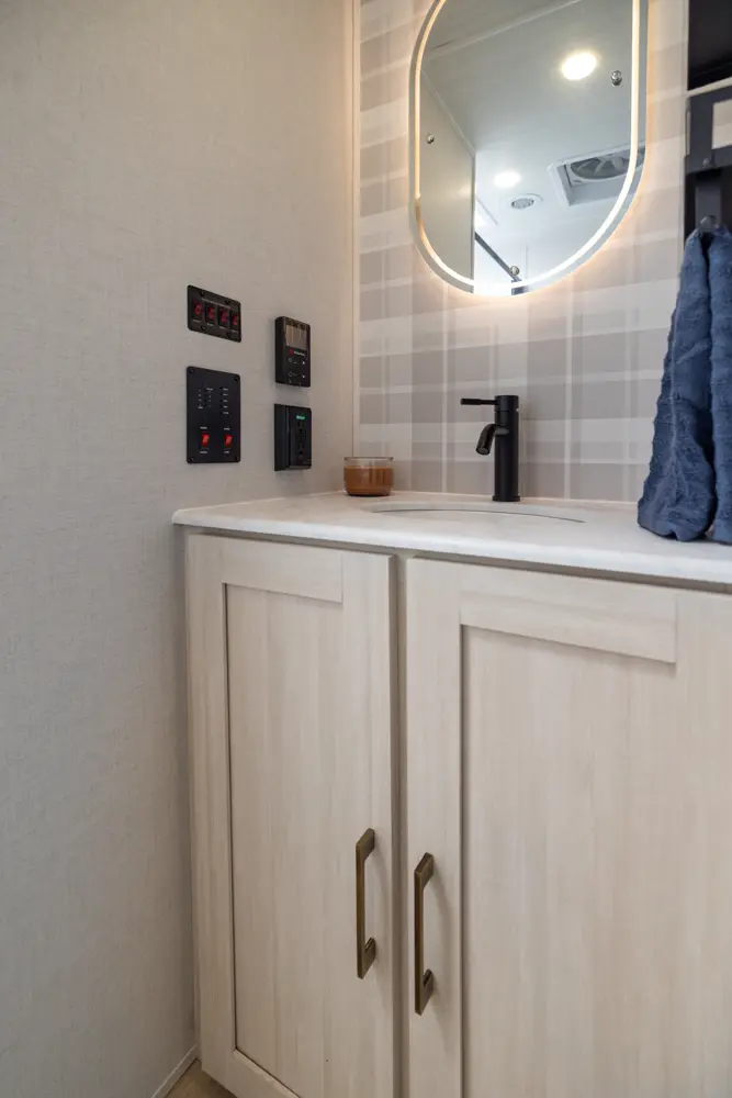 This 36' 7" travel trailer offers a spacious rear living area with dual opposing slides, creating an open, inviting space. The modern kitchen is equipped with a 10 cu. ft. 12V black glass refrigerator and a 3-burner residential-style range with glass cover. The custom king bedroom suite features ample storage, motion lighting, and a privacy wall. Exterior features include a 12' electric awning with LED lights, outdoor camp kitchen, TrailGate outdoor bar, and a hot & cold spray port.