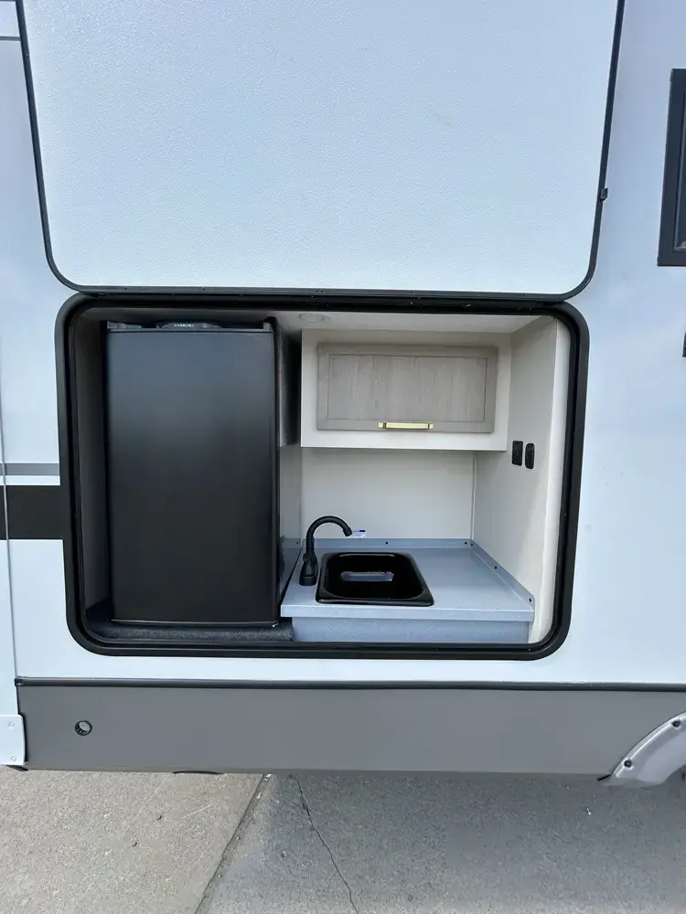 Want an outside kitchen, but don't want bunk beds? Then the 273RL is the camper for you! Two opposing slides offer an island, and tons of indoor space. The large awning offers lots of shaded entertaining space and covers the outdoor kitchen.