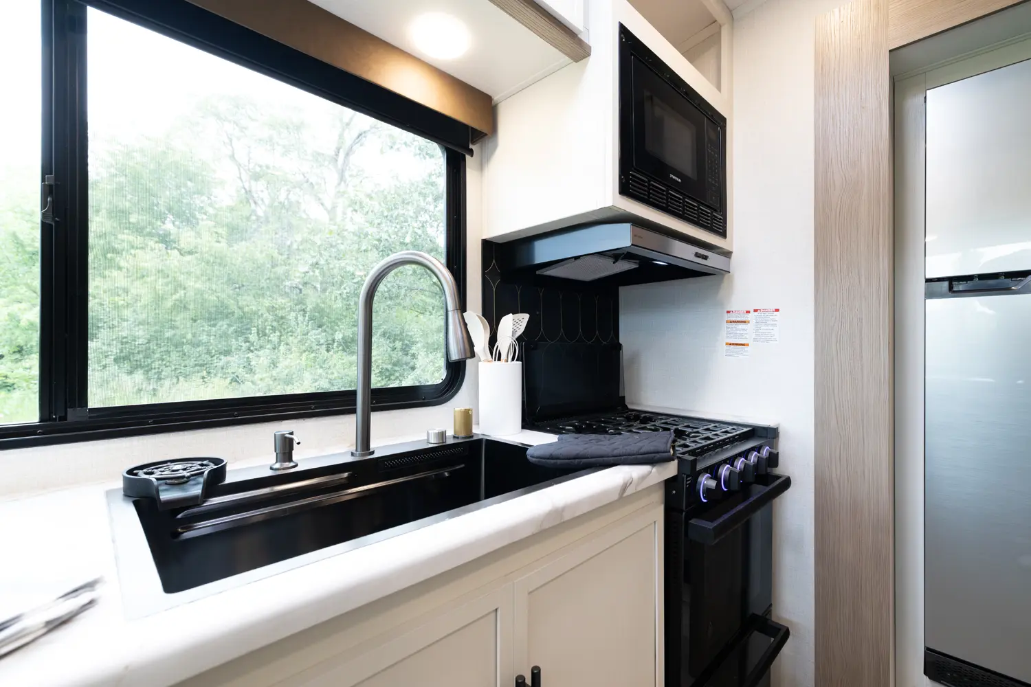 • Deep Single Bowl Task Sink Including High-Rise Pull-Down Faucet Sprayer, Waterfall Faucet, Glass Washer, Soap Dispenser, Countertop Strainer Control, Colander, Task Basket, Cutting Board
