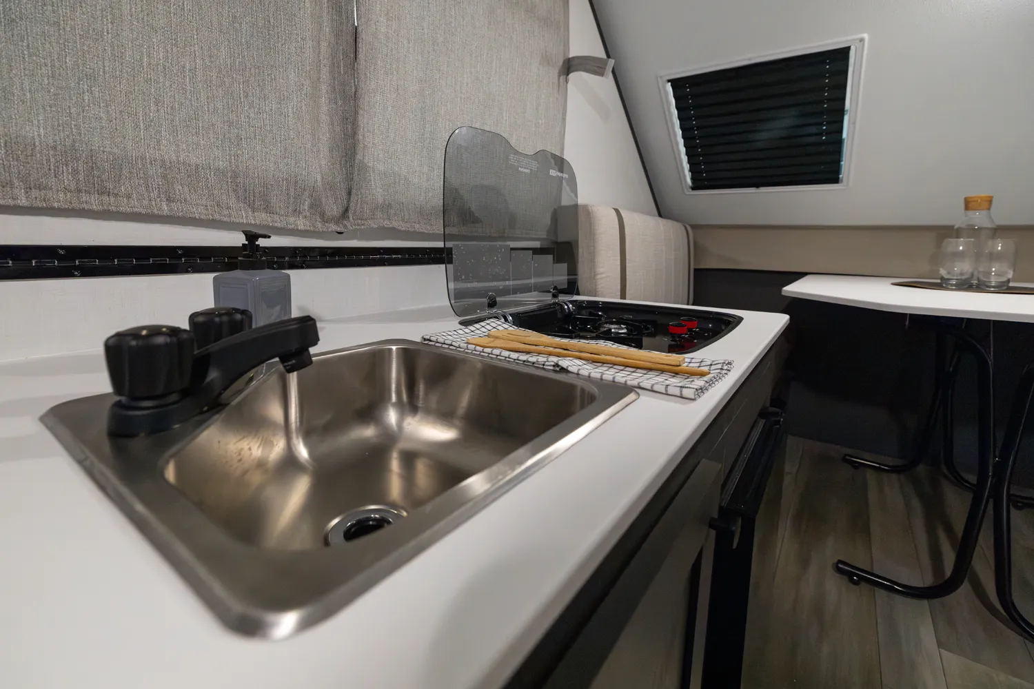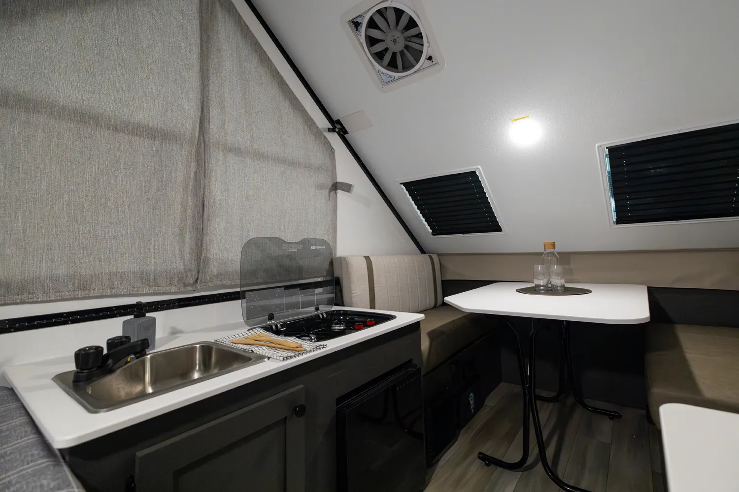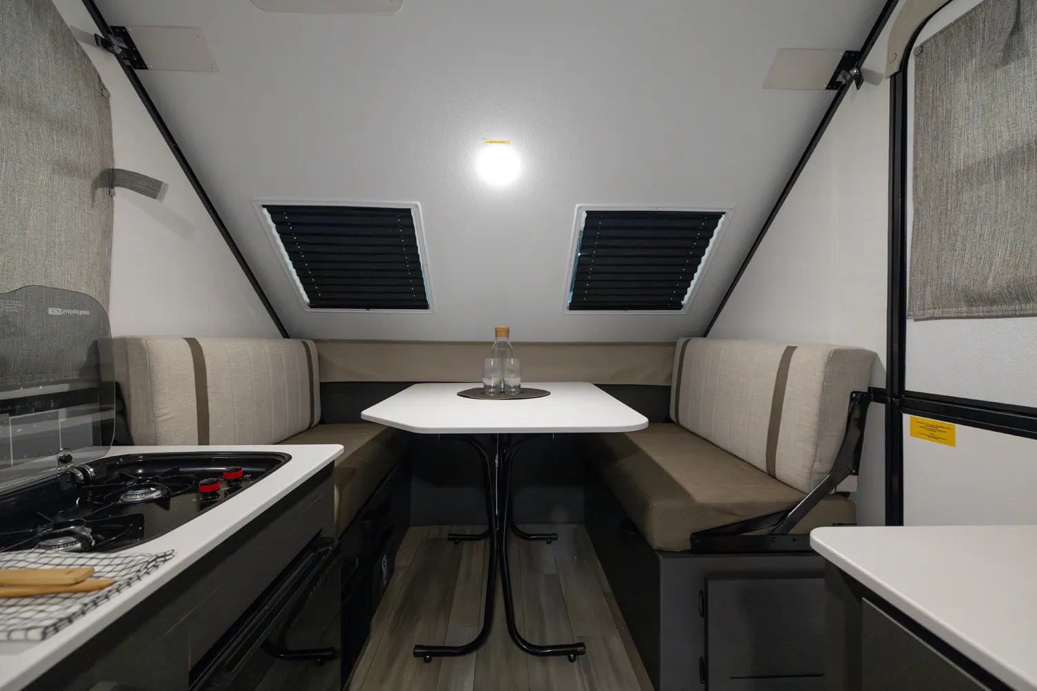 The A122S is exactly like the A122 with a large storage area on the front with all the comfort features and sets up into a firm structure in just minutes. The large window on the front side gives the dinette plenty of seating for four. If you're looking for a small A-frame camper with tons of storage, this is the camper for you.