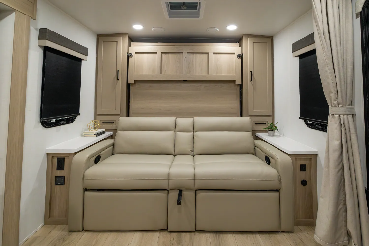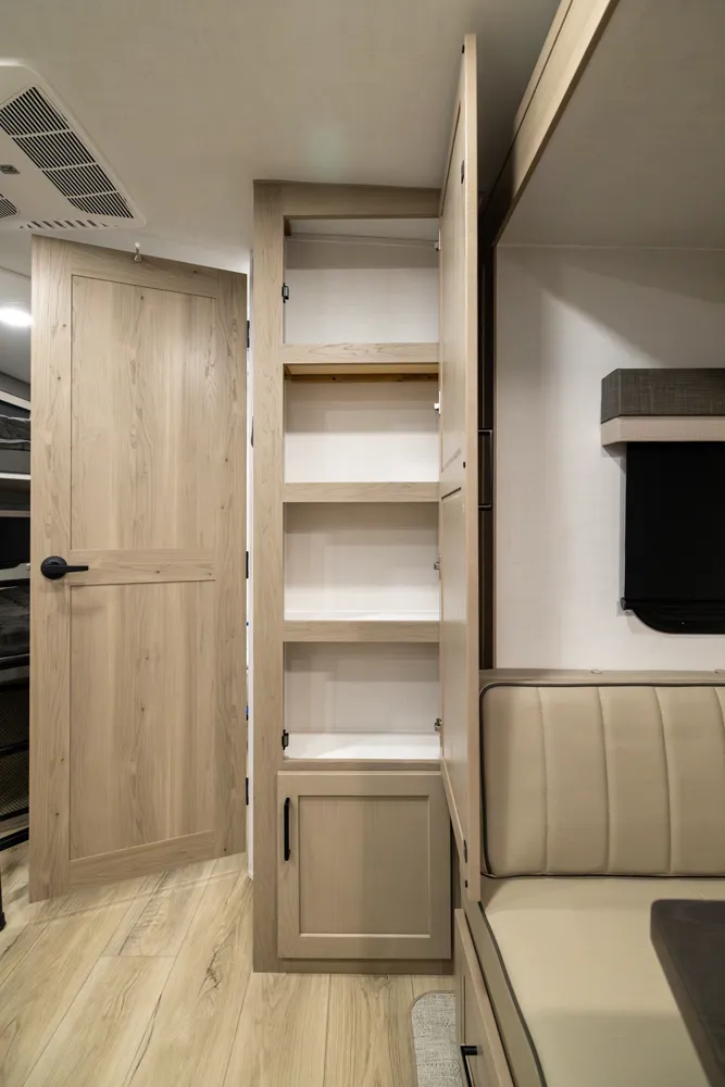 This is the perfect family trailer towing under 26' feet. The double 48" X 72" bunkhouse is awesome for sleeping the kids and even fits adults comfortably. The bottom bunk folds up for even more storage and toys will fit nicely underneath! The big 60" X 74" murphy bed folds up into a sofa for daily use. The giant 18' awning goes almost all the way across your unit while covering the outside kitchen.