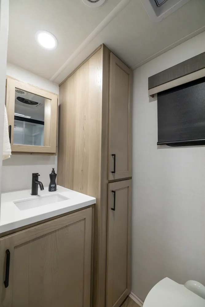 The front kitchen with a large window creates an open, inviting feel with great campsite views. Theater seating faces the entertainment center for easy viewing, with an optional hide-a-bed for guests. The bedroom includes a queen bed in a slide-out, dresser, and wardrobe with washer/dryer prep. A spacious bathroom with a large shower and linen storage adds comfort and convenience, making this coach feel like home.