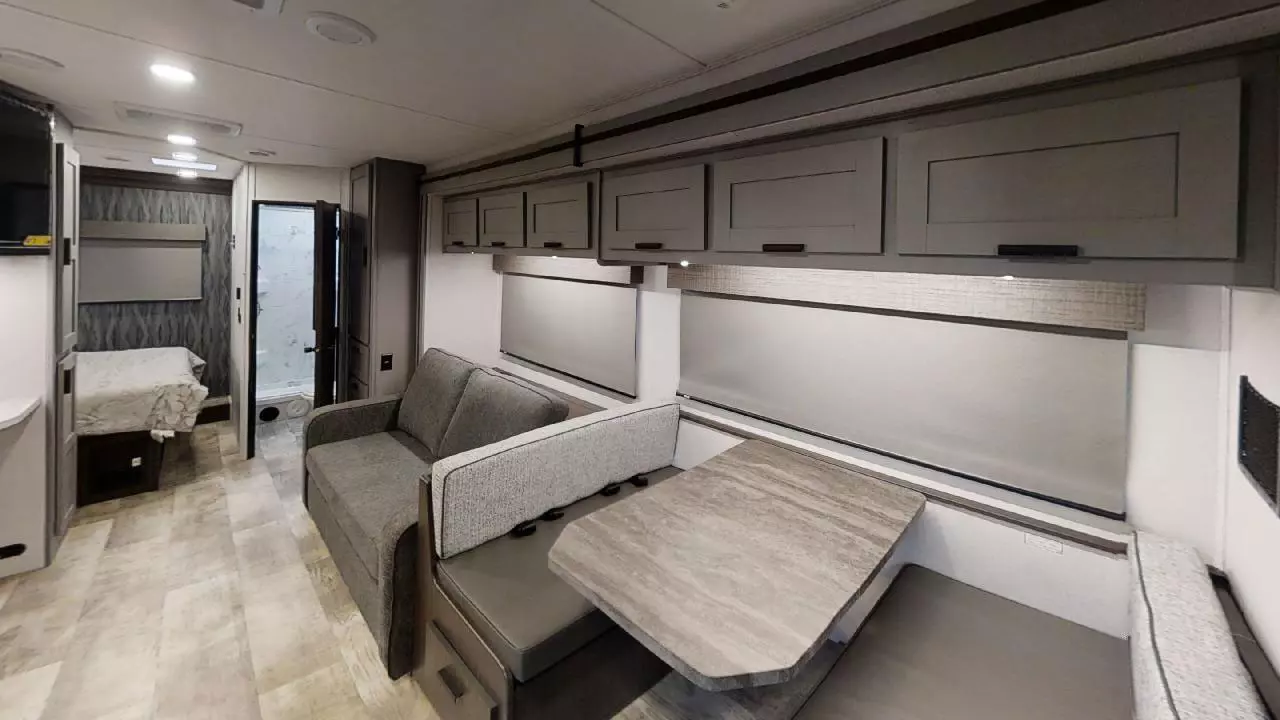 Enjoy at home comforts while on the road with a work station below the 12V TV and flush floors in the bedroom and living area. The rear corner bathroom features a 24" x 32" shower with skylight for natural lighting. The kitchen area is fully equipped with a 10.7 cu ft 12V refrigerator, recessed 3-burner range with flush glass cover, and a 1.3 cu ft convection microwave oven. Overhead cabinets provide additional storage. The 60" x 80" bunk over cab provides room for sleeping and a 12V LED TV.