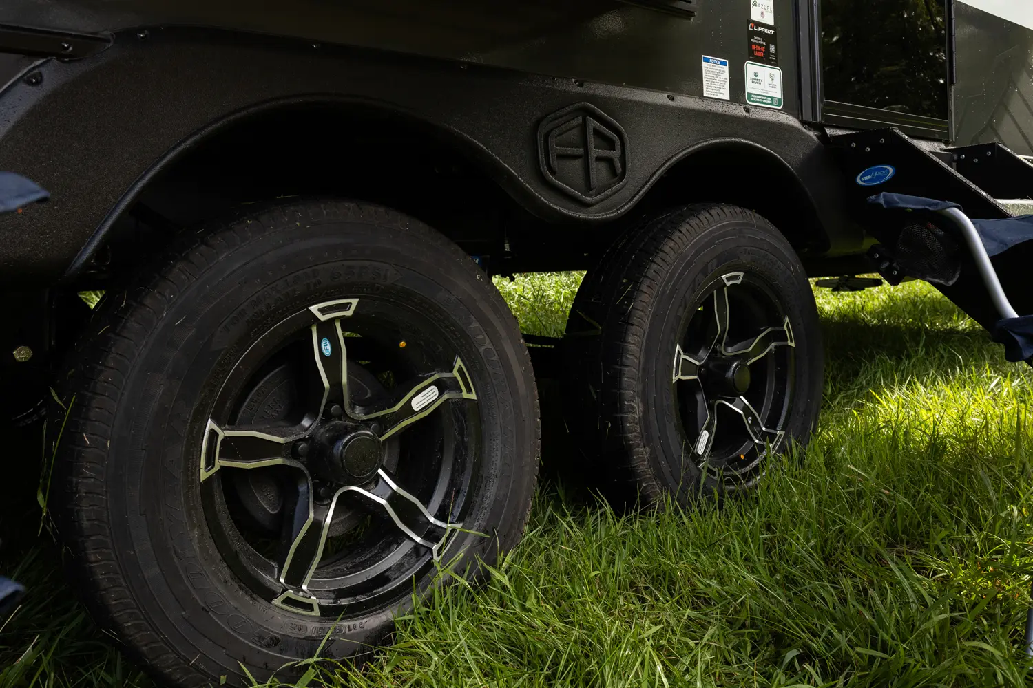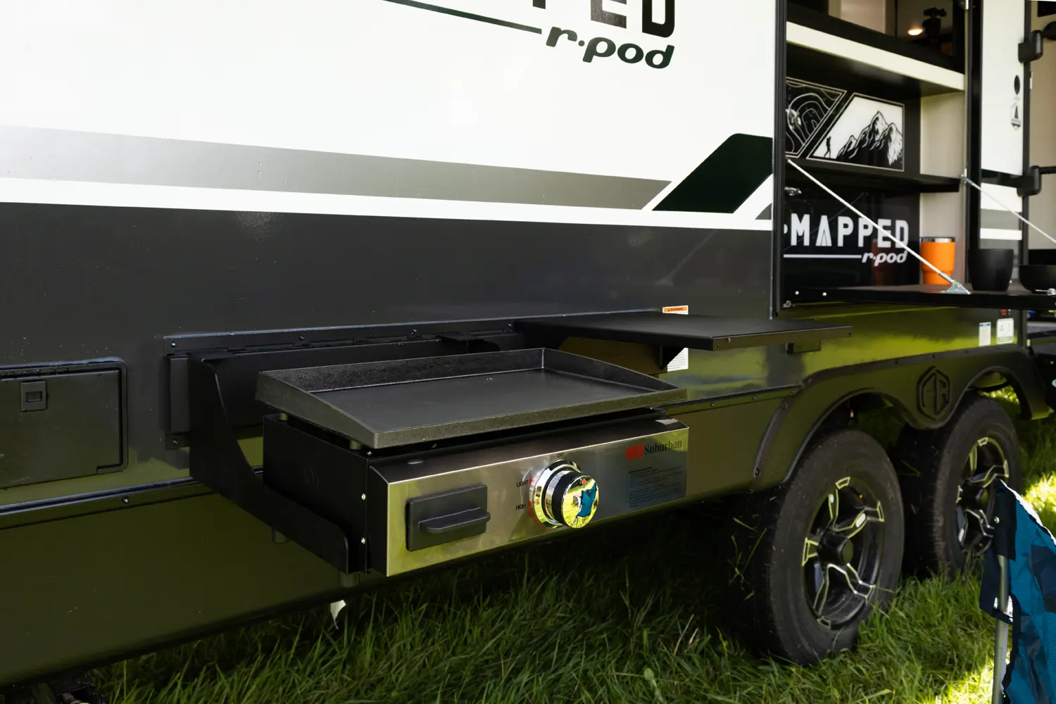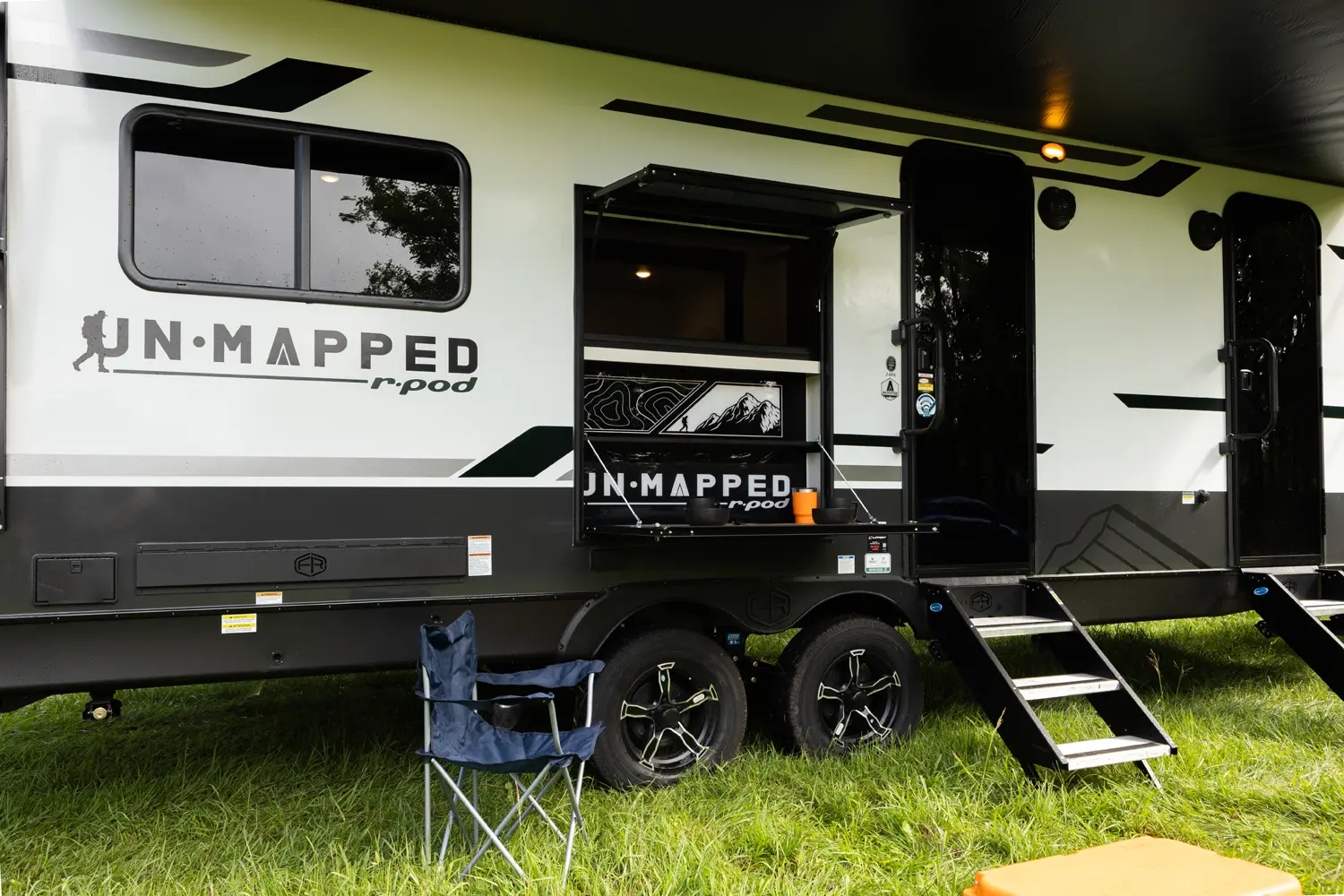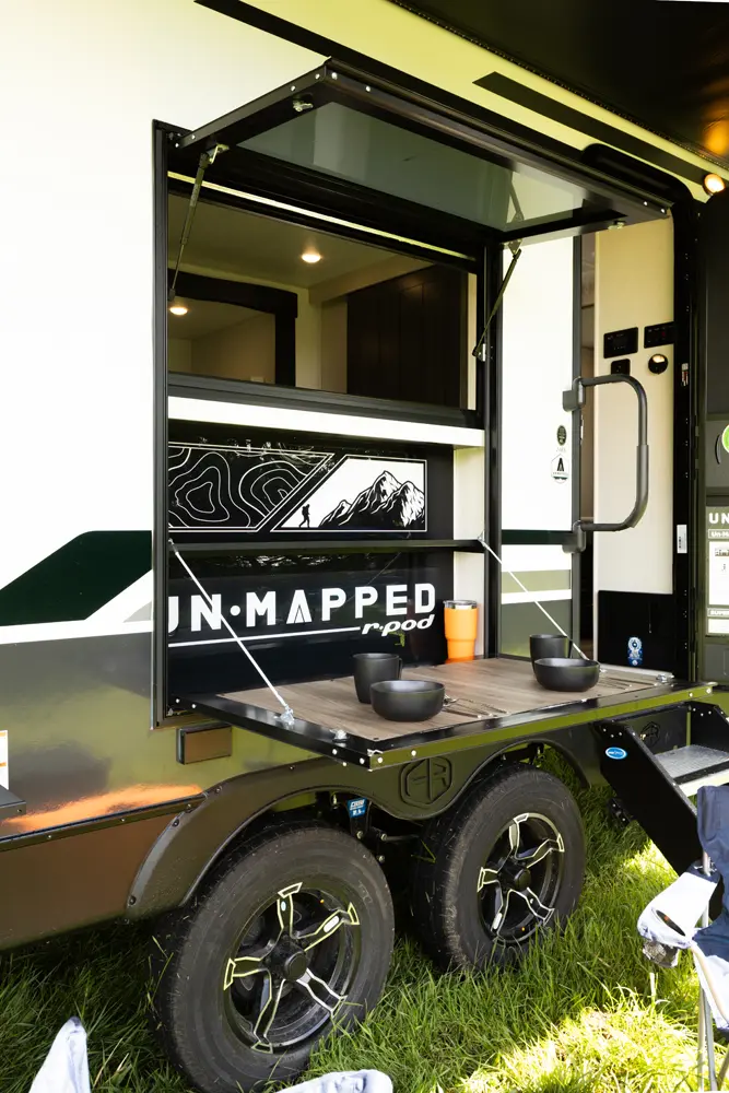 The Un•Mapped 24RK features a rear kitchen layout with a 12V black glass refrigerator, and an air fryer microwave. The Bar2Table pull-out dinette and TrailGate outdoor bar enhance dining flexibility and outdoor entertaining. Inside, enjoy a king bed, 15K A/C, and a tankless on-demand water heater. Exterior amenities include a 21' powered awning and a hot & cold spray port.