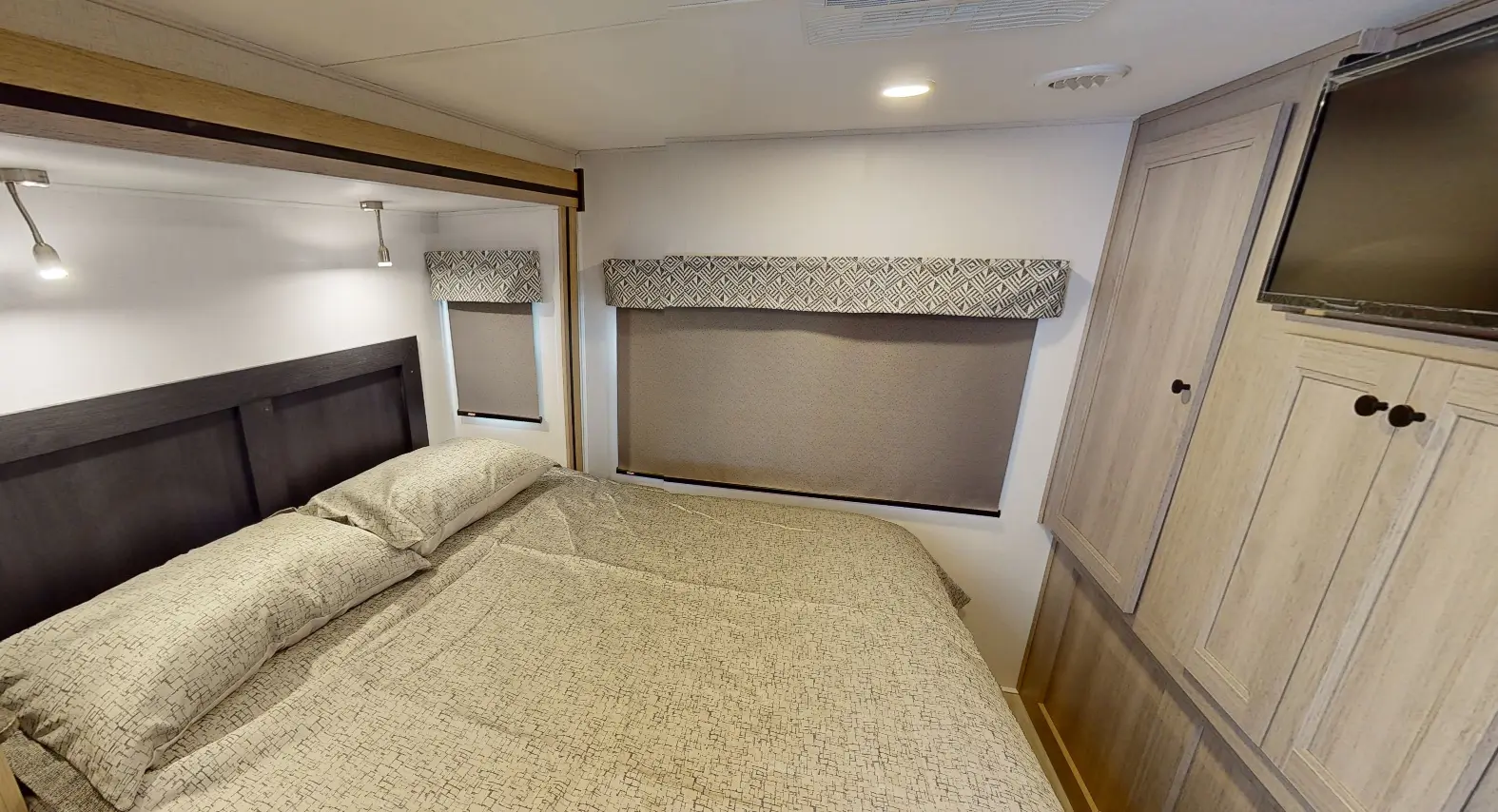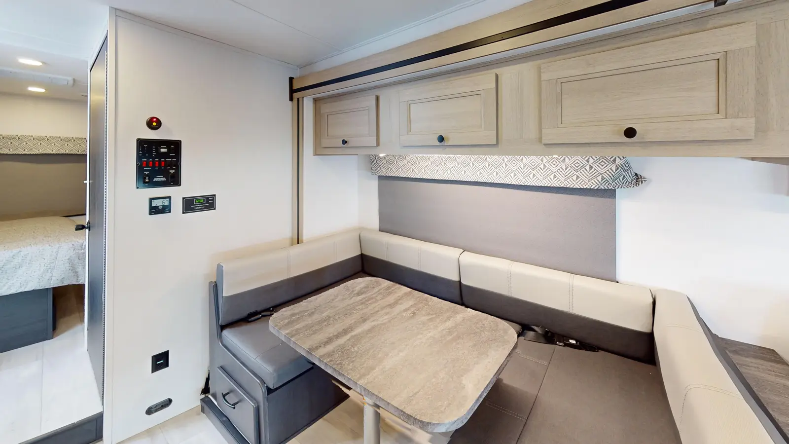 The 3011DS has 2 slide outs and sleeps 8. Outside, there's a 12V TV and storage compartments. Inside, you have a rear queen bedroom with a 60" x 74" walkaround bed and wardrobes, a split bathroom and a living area. The kitchen offers countertops, a pantry, 12V 10 cu ft refrigerator, convection microwave, and 3-burner stovetop. Overhead cabinets provide loads of storage. There's a large U-shape dinette next to a sofa (opt. 12V power theater seats). A cab over bunk provides a 60" x 80" mattress.