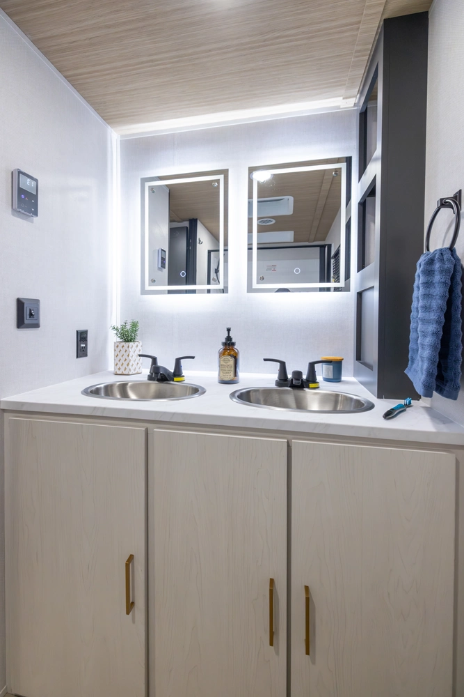 • Universal Docking Station Enclosed in Cargo Storage - Hookups Included: Cable & Satellite Switch, Fresh-Tank Gravity Fill, City Water, Black Tank Flush, Winterization Pump, Outdoor Shower, GFI Outlet, And Space Prepped for Solar Panel Controller