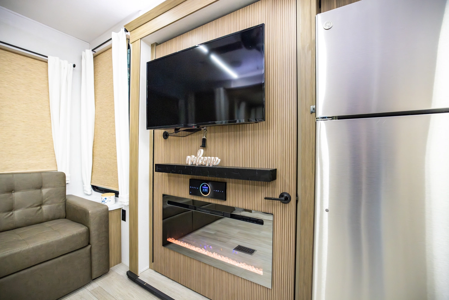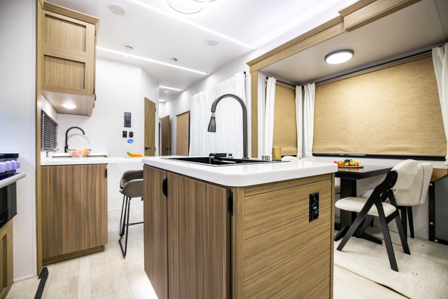 The 40RLB is an open floorplan that maximizes space for a residential cottage look and feel. The large king bedroom provides plenty of storage and washer/dryer hookup. The bathroom offers a walk-in shower with built-in seat, skylight, and linen cabinets. The island kitchen provides residential appliances and plenty of room for all the cooking essentials. Don’t forget the awesome view out the panoramic windows.