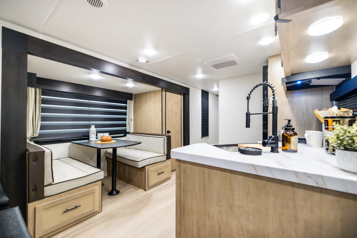 The triple slide is the perfect unit for affordable luxury and livability. The rear entertainment living room is surrounded by panoramic windows as well as two sofa slide and two recliners. The chef’s kitchen, kitchen bar with stools, and dinette slide with slide out drawers and full door pantry offer meet the needs of any chef. The private master suite completes the interior. Outside enjoy the camp kitchen, outside entertainment speakers, and TV bracket under our power awning.