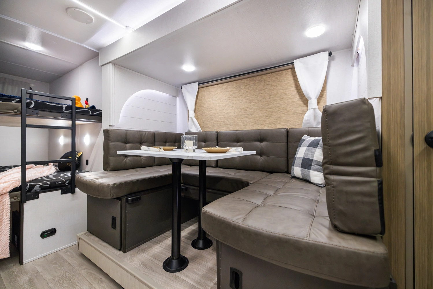 The 240BHXL weighs in at less than 6,000 lbs. for increased towability, without sacrificing any of the comfort! This double-over-double bunkhouse packs a lot of features into its 28'10” length, including a large comfy booth dinette with panoramic windows, walk-in pantry, modern kitchen with stove, cooktop, microwave, and an oversized refrigerator! The bathroom provides a walk-in shower with skylight and a convenient second door to the outside.